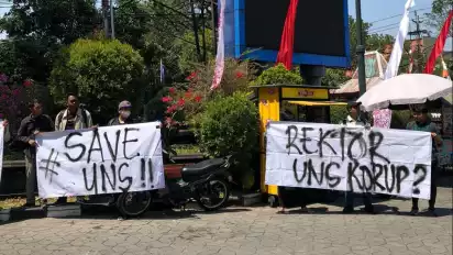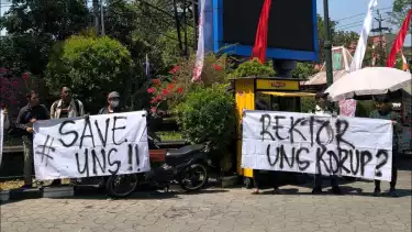 Diketahui ada tiga spanduk yang dibentangkan oleh sejumlah mahasiswa, diantaranya 'Save UNS', 'Rektor UNS Korup?', hingga 'Welcome to Kampus Anti (disilang) Korupsi'.