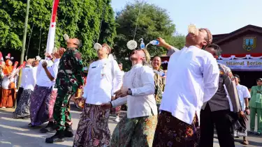 Kudus, tvOnenews.com - Suasana Pendapa Kabupaten Kudus, Jawa Tengah lebih meriah dari biasanya. Ratusan pegawai tumpah ruah di halaman Pendapa mengenakan Kudusan dan atribut 17an, Kamis (10/8/23).