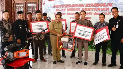 Bupati Semarang, Ngesti Nugraha yang menyerahkan secara langsung ratusan alat mesin pertanian kepada para kelompok tani, berharap dengan adanya bantuan ini bisa menungkatkan produktifitas hasil pertaniak Kabupaten Semarang.
