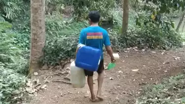 Dengan membawa alat seadanya seperti ember, jerigen, warga harus berjalan kali sekitar 4 kilo meter untuk menuju sumber mata air.