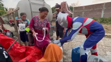 Pati, tvOnenews.com - Berbagai cara dilakukan relawan untuk membantu warga yang kekurangan air bersih akibat kekeringan. Di Pati, Jawa Tengah, aksi heroik dan menghibur dilakukan seorang relawan saat mendistribusikan bantuan air bersih kepada warga yang mengalami krisis air bersih.