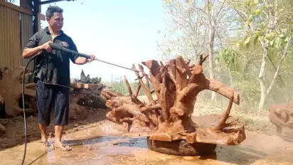 Dirinya menyampaikan proses awal pengolahan limbah akar jati ini berkat adanya izin dari pihak Perhutani.