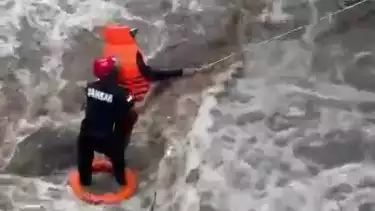 Untuk menyelamatkan Alfian yang tampak berjuang memeluk sebuah batu agar tidak terseret arus, seorang anggota pemadam kebakaran turun dari jembatan setinggi kurang lebih 5 meter dengan menggunakan tali.