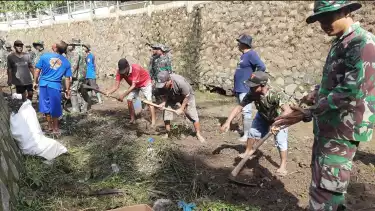 Siaga Bencana Banjir dan Longsor, Personel TNI dan Warga di Wonogiri Bersih-Bersih Sungai