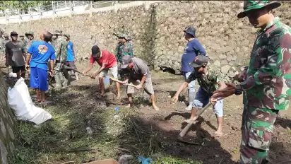 Mengantisipasi bencana banjir dan tanah longsor pada musim penghujan, ratusan personel TNI Kodim 0728 Wonogiri bersama warga dan pihak terkait melakukan bersih bersih Sungai Dudan.
