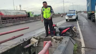 Semarang, tvOnenews.com - Seorang pengendara sepeda motor di Semarang, Jawa Tengah terjatuh dari jembatan layang Pelabuhan Tanjung Emas setelah menabrak pembatas jalan pada Jumat (19/1/2024).