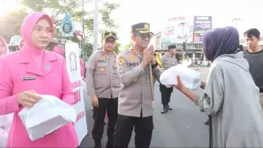 Kapolres Purworejo AKBP. Eko Sunaryo, SIK. M.K.P bersama Ketua Bhayangkari Cabang Purworejo Ny. Dwi Sunaryo langsung turun ke lokasi menyasar warga yang lewat dengan membagikan paket takjil, turut hadir pula Wakapolres Purworejo Kompol Fadli, SH.SIK.MH dalam membagikan takjil dengan diikuti para pejabat utama Polres Purworejo lainnya.