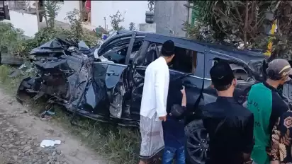 Namun saat hendak melintasi perlintasan kereta dari selatan, tanpa diketahui tiba-tiba dari arah barat meluncur kencang menabrak mobilnya yang terpental sepuluh meter hingga kondisi mobil rusak parah.