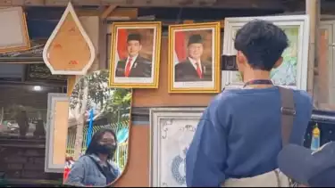 Solo, tvOnenews.com - Wiwik Ernawati, salah satu pedagang di Kota Solo yang berada di kawasan Sriwedari sudah mulai memajang foto bingkai Prabowo-Gibran di depan kiosnya.