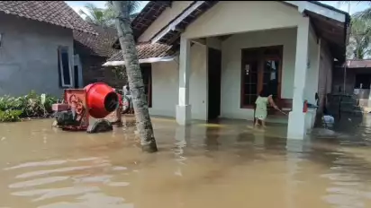 " Tadi dini hari waktu air mukai naik, ketinggian air yang masuk rumah warga bisa mencapai satu meter. Warga ramai ramai menyelamatkan harta benda dulu. Yang oenting tidak terendam banjir. Jadi belum ngungsi," terang Nayiri, salah seorang warga Rowosari.