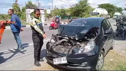 Hantam Pantat Motor Roda Tiga di Jalan Raya Jogja-Solo, Mobil Brio Ringsek