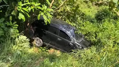 Saat mobil terperosok menyangkut di pepohonan sehingga tidak sampai terjun ke dasar jurang yang curam dan dalam.