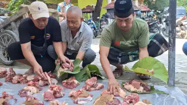 Brebes, tvOnenews.com - Perayaan Hari Raya Iduladha identik dengan penyembelihan hewan kurban. Namun, yang unik dalam pembagian daging kurban ini, yang biasanya dibungkus menggunakan kantung plastik, kali ini dikemas menggunakan daun jati.