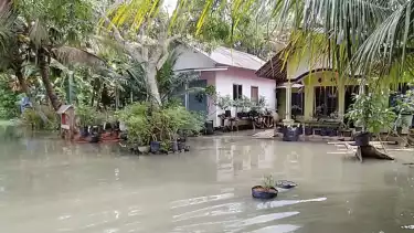 Cilacap, Jawa Tengah - Hujan dengan itensitas tinggi terus mengguyur Wilayah Cilacap, Jawa Tengah, dalam beberapa waktu kebelakang. Hujan deras ini mengakibatkan sungai yang berada di Desa Tarisi meluap dan menggenangi pemukim rumah warga.