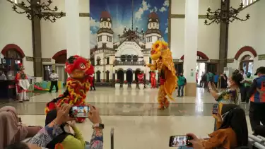 Semarang Jawa Tengah - Menyambut Tahun Baru Imlek 1 Februari 2022, PT Kereta Api Indonesia (Persero) Daerah Operasi 4 Semarang menggelar atraksi Barongsai di Stasiun Semarang Tawang pada Selasa (1/2/2022). Atraksi ini berlangsung selama 60 menit yang dimulai pukul 14.00 WIB.