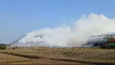 Pati, tvOnenews.com - Sampah yang menggunung di tempat pembuangan akhir/ (TPA) Plosojenar, Kecamatan Jakenan, Kabupaten Pati, Jawa Tengah, terbakar, pada Jumat (18/10/2024) siang.