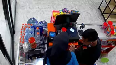 Pria berbaju hitam tersebut masuk ke dalam toko kemudian langsung menghampiri karyawati toko. Karyawati toko sempat memberikan uang koin kepada pria tersebut.