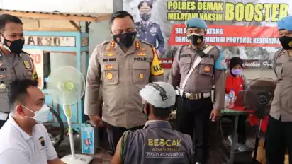 Demak, Jawa Tengah - Ratusan tukang ojek wisata di Demak, Jawa Tengah mengikuti vaksin Covid-19 melalui program vaksinasi Tukang Ojek Wisata Kota Wali (si Kang Jaka). Vaksinasi ini digelar Polres Demak di pangkalan ojek Wisma Khasanah Komplek Masjid Agung Demak, Selasa (1/3/2022).
