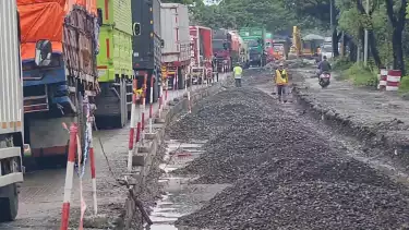 Pati, Jawa Tengah - Perbaikan jalan Pantura Pati - Rembang tepatnya di sekitar Desa Lengkong, Kecamatan Batangan, Kabupaten Pati, Jawa Tengah, membuat arus lalu lintas kembali mengalami kemacetan cukup parah, Rabu (23/3/2022).