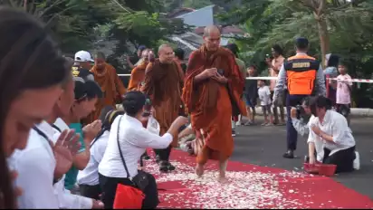 Semarang, tvOnenews.com - Ribuan warga Kabupaten Semarang, Jawa Tengah, berjajar disepanjang jalan Gatot Subroto, Ungaran, Kabupaten Semarang hingga Vihara Avalokitesvara Sri Kukusrejo Gunung Kalong, Rabu (7/5/2025).