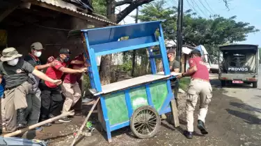 Petugas Satpol PP mengerahkan buldoser untuk merobohkan lapak-lapak liar yang dipakai untuk usaha rumah makan, bengkel, dan lain-lain. Total ada 19 bangunan yang dibongkar.