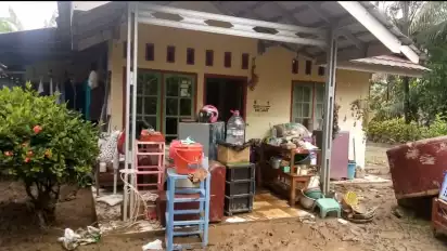 Tembok rumah bagian samping jebol karena hantaman air yang cukup kencang. Alat-alat rumah tangga pun seperti lemari, kompor, dan alat elektronik lainnya rusak dan kotor.