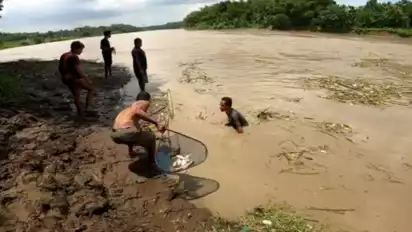 "Udah lemas, pakai tangan aja bisa ditangkap. Beberapa masih ada yang kuat lalu berenang ke dalam air lagi," ujar Warlan, warga lainnya.