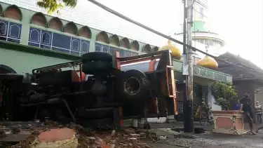 Kendal, Jawa Tengah - Sebuah truk tangki oleng dan menabrak pagar Masjid Agung Kendal Jawa Tengah, Rabu (6/4/2022) pagi tadi, ketika jamaah sedang melaksanakan salat subuh. Truk terguling setelah merobohkan pagar besi dan menabrak kios rokok dan becak.
