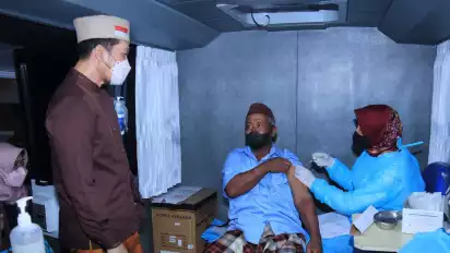 "Mbah badhe vaksin, nggih? Sampun kaping pinten? (Mbah, mau vaksin ya? Sudah vaksin yang ke-berapa)?" sapa Hartopo penuh perhatian.