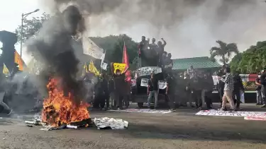 Dalam aksinya mahasiswa membentangkan poster dan spanduk yang berisikan kritikan kepada pemerintah. Tak hanya itu, mereka juga membakar keranda dan ban bekas sebagai bentuk protes.