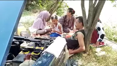 Tri Yusianto (40), pengendara tersebut, terlihat lelah saat ditemui tvonenews. Ia beristirahat di bawah pohon di rest area 424 B tol Semarang ABC, Jumat (6/5/2022) siang. Keluarganya tiduran dan sebagian makan bekal yang dibawa dari Purworejo.