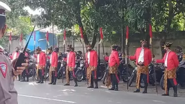 Tamu undangan yang menghadiri prosesi akad nikah adik Jokowi dan Ketua MK di Graha Saba Buana, Solo pagi tadi (26/5/2022) disambut prajurit keraton yang mengenakan seragam kebesaran berwarna merah sambil membawa senjata tombak yang dipucuknya dipasangi bunga melati.