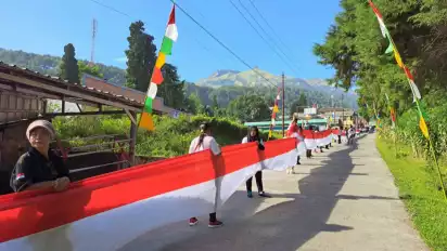 Peringati HUT RI ke 77, Bendera Sepanjang 1 Km Diarak Warga di Lereng Gunung Merbabu