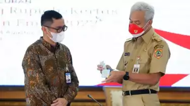Setelah seremoni perilisan uang emisi baru tahun 2022, Kepala Perwakilan Bank Indonesia Provinsi Jawa Tengah Rahmat Dwisaputra menyerahkan buku album berisi tujuh uang rupiah dengan desain baru mulai pecahan Rp1.000 sampai Rp100.000.
