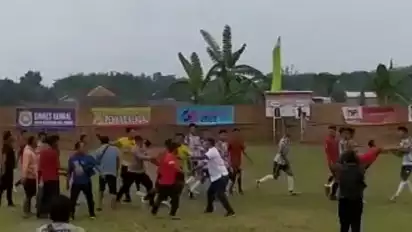 Sejumlah penonton masuk ke lapangan memprotes wasit dan official, hingga terjadi saling dorong dan ricuh.