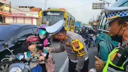 " Kepada pengendara yang membawa anak namun tidak menggunakan helm, kami berikan edukasi agar membiasakan tertib sejak dini dengan menggunakan helm, “ jelasnya.