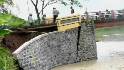 Kendal, Jawa Tengah - Hujan deras yang melanda wilayah Kendal, Jawa Tengah beberapa hari ini menyebabkan kerusakan sejumlah fasilitas umum, salah satunya jembatan.