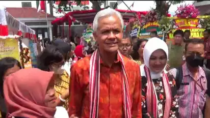 "Loh jenangan klambine abang mas? Ora popo. Pikirane rasah werno-werno. Inggih pak kebetulan jatahe niki. Warna niku sakniki mesakne, nasibe si warna iku mesakne. Klambi bedo we hayo kowe nang endi kih. Sensi nggih. Mesakne si warna kih, makane wernane pelangi wae," seloroh Ganjar yang disambut tawa tamu yang hadir.