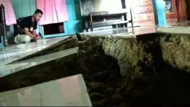 Retakan pada dinding dan lantai rumah maupun masjid dilokasi tersebut menganga 5 hingga 10 sentimeter, retakan tersebut juga membuat sebagian rumah sudah terlihat miring dan tak layak dihuni.