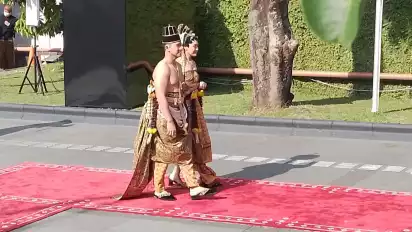Solo, Jawa Tengah - Pasangan pengantin Kaesang Pangarep-Erina Gudono hari ini, Minggu (11/12/2022) menjalani prosesi adat ngunduh mantu di Loji Gandrung Kota Surakarta. Keduanya memakai busana adat yang disebut dodot Solo Basahan.Â
