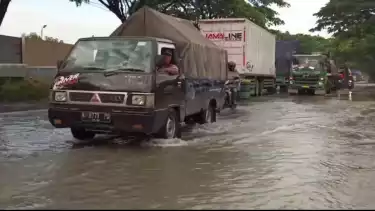 Pati, Jawa Tengah - Banjir yang merendam dua Desa di Kecamatan Batangan, Kabupaten Pati, Jawa Tengah, tidak hanya merendam permukiman dan fasiltas umum. Namun banjir kini juga merendam jalur pantura Pati–Rembang, dengan ketinggian air mencapai 30 centimeter, Sabtu (17/12/2022).