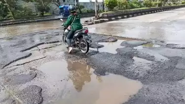Semarang, Jawa Tengah - Pasca banjir yang melanda selama hampir sepekan, jalan pantura Kaligawe Kota Semarang, Jawa Tengah kini penuh dengan lubang. Para pengendara pun kini dihantui kecemasan terjebak dalam lubang yang sebagian masih tertutup genangan air.Â