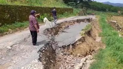 Kondisi jalan sendiri hampir putus sehingga sangat membahayakan pengguna kendaraan yang melintas.