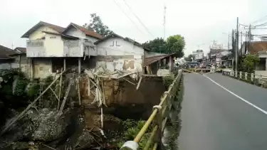 Selain tiang jembatan, tebing Kali Pelus di kedua sisi juga terlihat longsor. Rumah dan bangunan di bibir kali mengalami retak-retak, bahkan ambruk.
