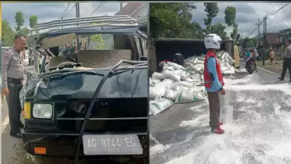 Akibat kecelakaan itu, truk terguling menutup jalan. Sementara mobil pikap kabin depan ringsek parah.