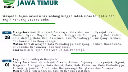 Peningkatan kewaspadaan ini dikeluarkan oleh BMKG Juanda untuk tiga hari kedepan dari tanggal 28 Februari hingga 2 Maret 2023. Kewaspadaan ini dikeluarkan agar masyarakat di beberapa wilayah di Jatim waspada akan adanya bencana hidrometeorologi yang dapat mengakibatkan banjir, tanah longsor, dan angin kencang serta petir.