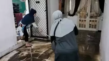 Wanita yang bisa dipanggil Mbak Nung ini tampak kerja ekstra membersihkan lantai dari lumpur.