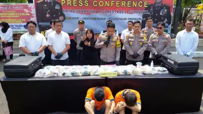 Kapolrestabes Surabaya, Kombes Pol Akhamad Yusep Gunawan mengatakan, puluhan kilogram sabu itu disita dari tas koper besar yang dibawa dua kurir bernama Muhammad Fajrin (23), warga Jalan Kelinci Kelurahan Tipulu, Kota Kendari dan Andri Pratama (28), asal Jalan Lorong Juwita, Kecamatan Jakabaring, Palembang.