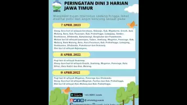Sidoarjo, tvOnenews.com - Masa pancaroba peralihan hujan ke kemarau, Badan Meteorologi Klimatologi dan Geofisika (BMKG) Juanda, mengeluarkan peringatan dini untuk meningkatkan kewaspadaan cuaca buruk angin kencang dan hujan deras disertai petir, sesaat untuk beberapa hari ke depan wilayah Jawa Timur, hari ini sampai tanggal 9 April 2023.
