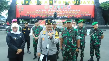 Apel Gelar Pasukan dalam rangka Operasi Ketupat 2023 ini dipimpin langsung oleh Gubernur Jawa Timur Khofifah Indar Parawansa, didampingi Kapolda Jawa Timur Irjen Pol Toni Harmanto dan Pangdam V Brawijaya Mayjend TNI Farid Makruf.
